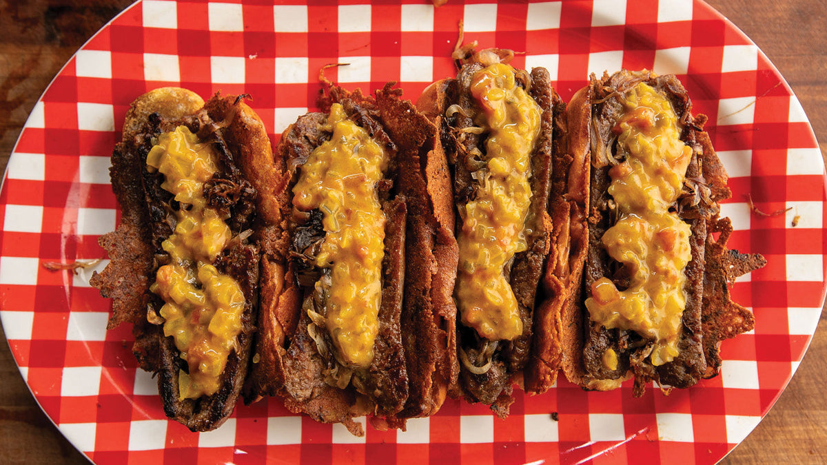Take your backyard cookout to bold new territory with these Cheesy Griddle Dogs—a sizzling spin on the classic sausage sandwich. Seared to perfection on the Yoder Smokers YS640s cast iron griddle, juicy sausages are pressed under a hot casserole dish for unmatched crust and caramelization. They're nestled into golden cheese-crusted buns, topped with deeply savory grilled onions and finished with a generous drizzle of tangy Chicago Sauce. Every bite is packed with texture and flavor—from the crispy cheese edges to the savory Trail Dust seasoning. This is backyard food with real character, made hot and fast on a professional-grade pellet grill.